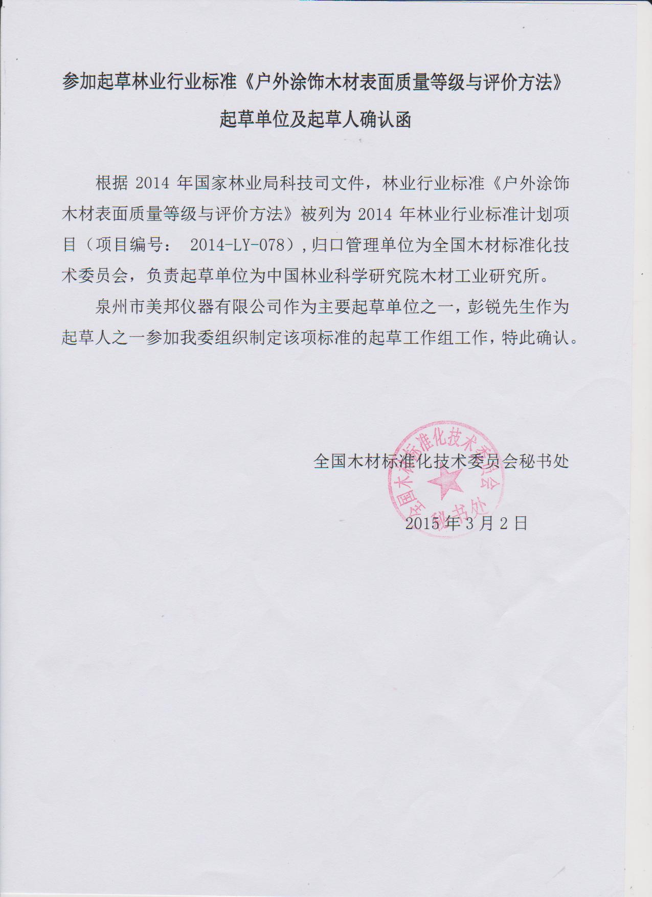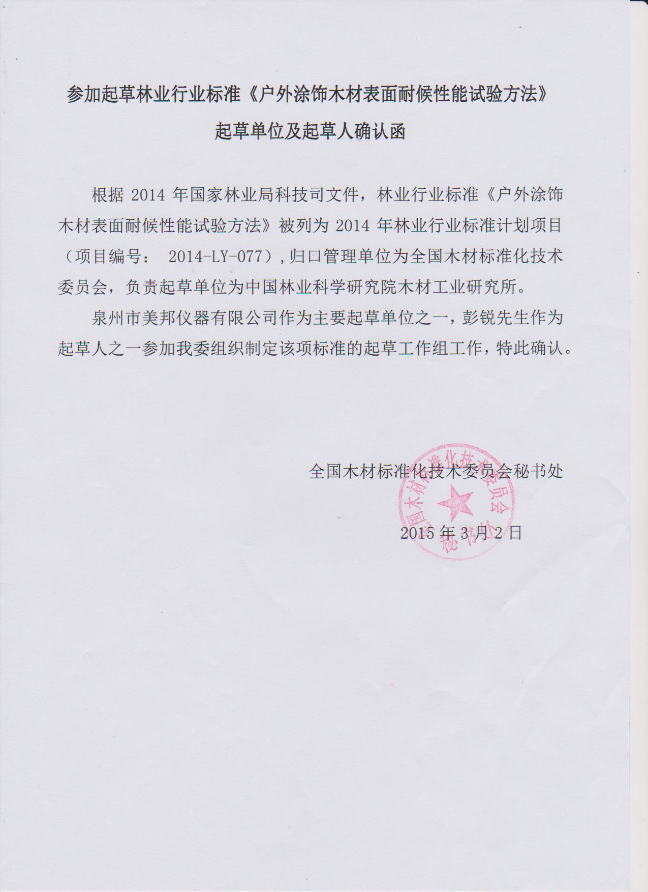 3月7日,美邦儀器起草的《戶外涂飾木材表面耐候性能試驗(yàn)方法》、《戶外涂飾木材表面質(zhì)量等級(jí)與評(píng)價(jià)方法》兩個(gè)標(biāo)準(zhǔn),經(jīng)過(guò)全國(guó)木材標(biāo)準(zhǔn)化技術(shù)委員會(huì)的多方論證,予以發(fā)函正式確認(rèn),不久將予以頒布。